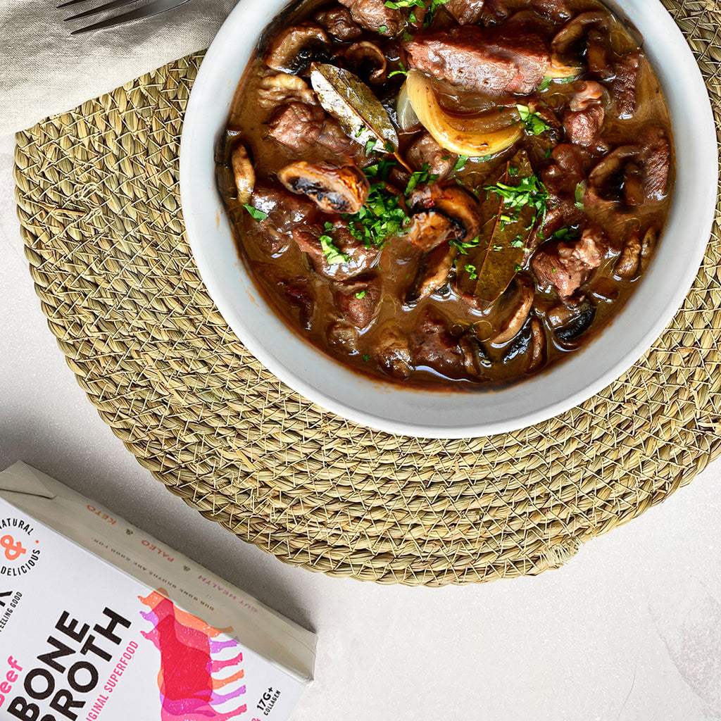 - Add the red wine, Freja Beef Bone Broth, bay leaves, thyme and bring to the boil. Then return the meat and pancetta to the pan.