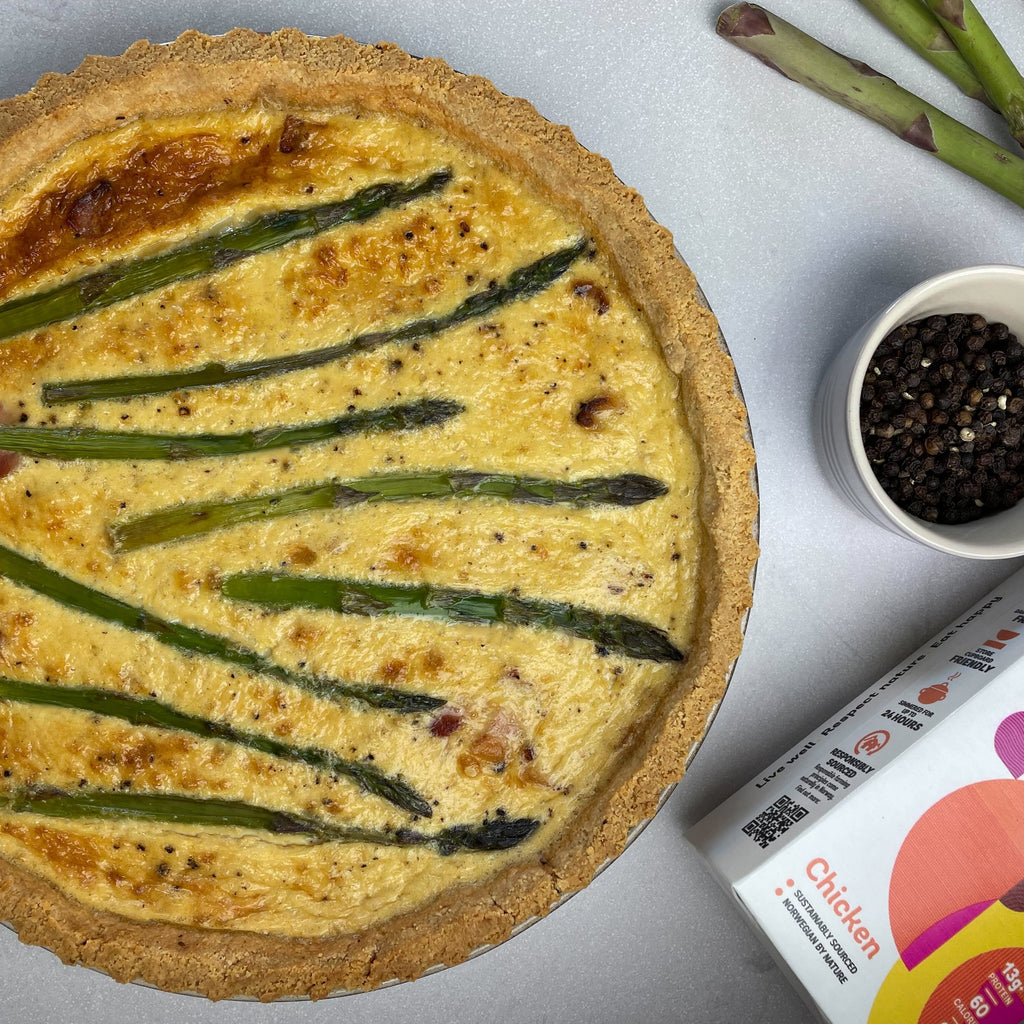 - Pour the filling into the cooled pastry crust. Arrange the blanched asparagus spears on top of the filling.