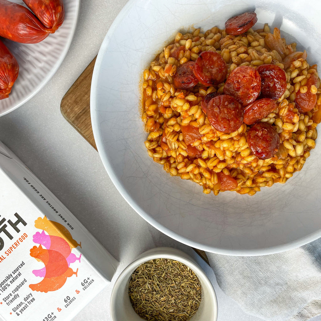- Tip in the tinned tomatoes, thyme and hot Chicken Bone Broth, bring to the boil then reduce the heat and leave to simmer for 30 minutes, stirring occasionally. All the liquid should have been absorbed after this time but if the pearl barely is still not tender you can top up with some extra water if needed.