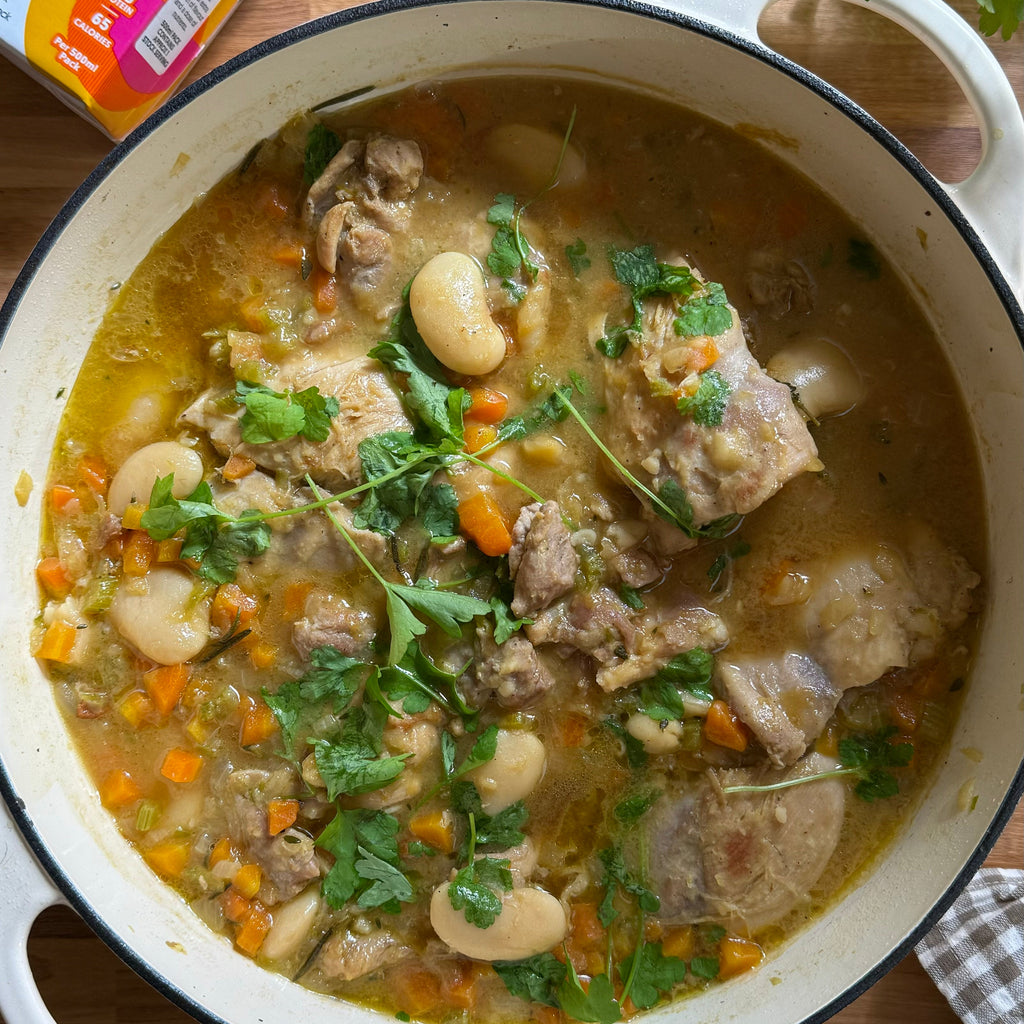 5. Scoop out about one third of the butter beans, mash until smooth, then stir back into the pot. Add the remaining whole beans and simmer for a few minutes until thick and glossy.