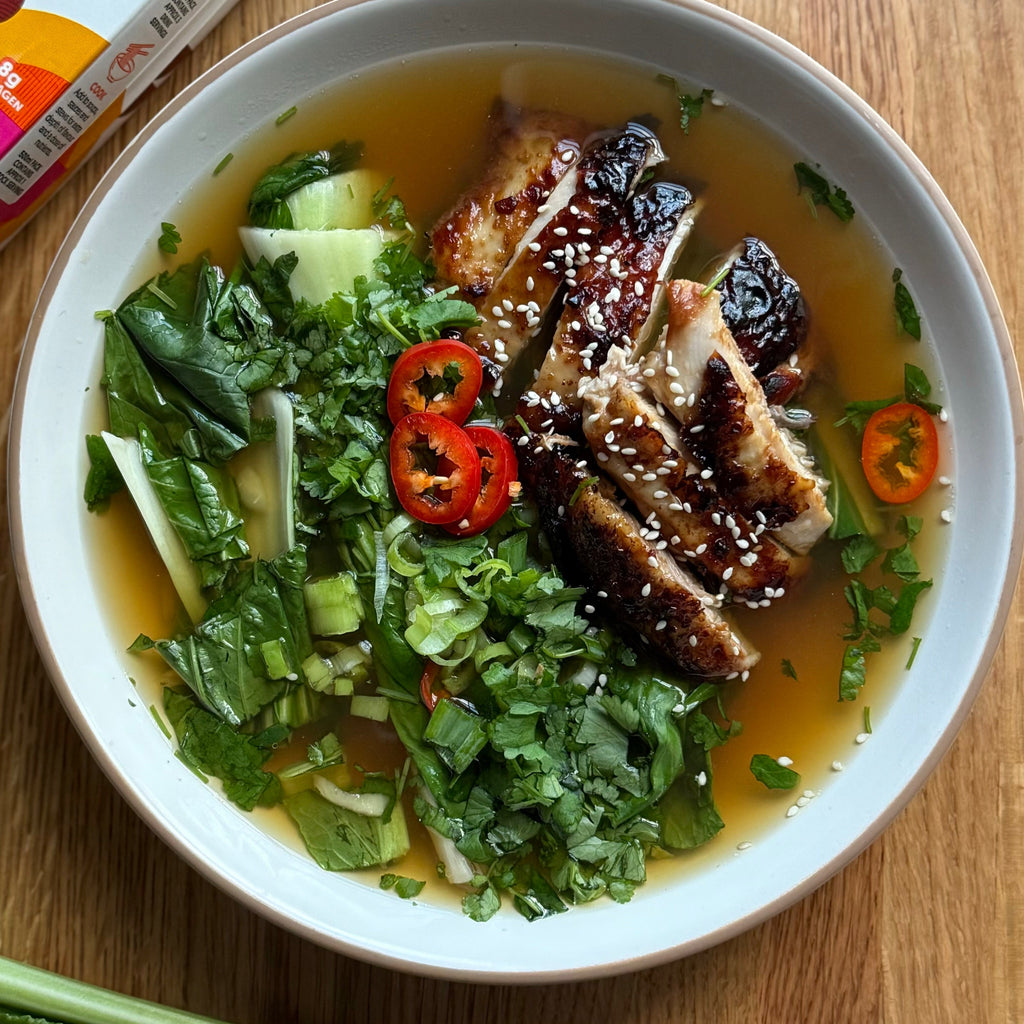 3. Prepare the broth: In a saucepan, combine bone broth, lemongrass, ginger, garlic, and chilies. Simmer gently for 5 minutes to infuse flavors.