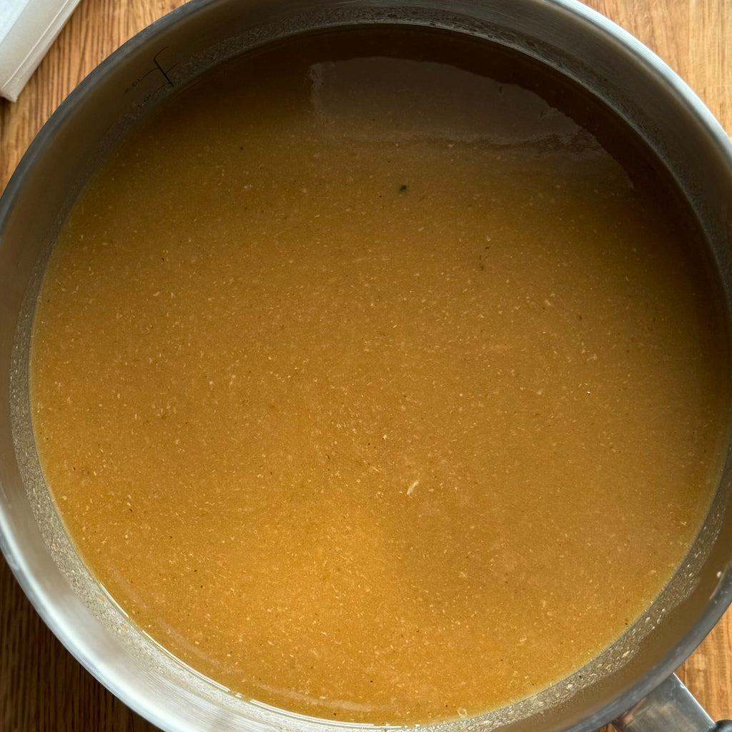 5. Slowly pour in 500 ml Turkey Bone Broth, whisking continuously.