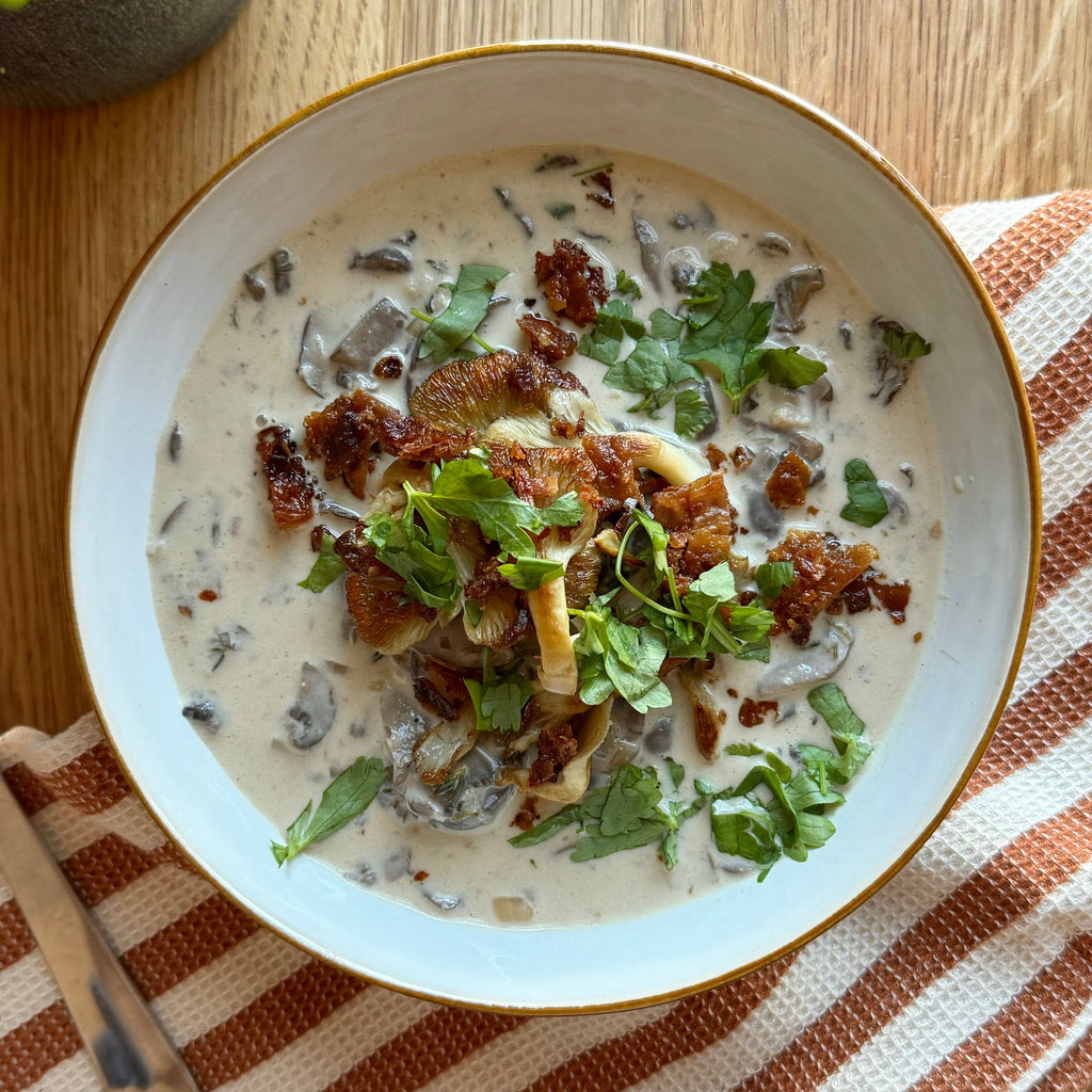 - Ladle soup into bowls, top with oyster mushrooms, pancetta parsley, a swirl of coconut milk or cream.