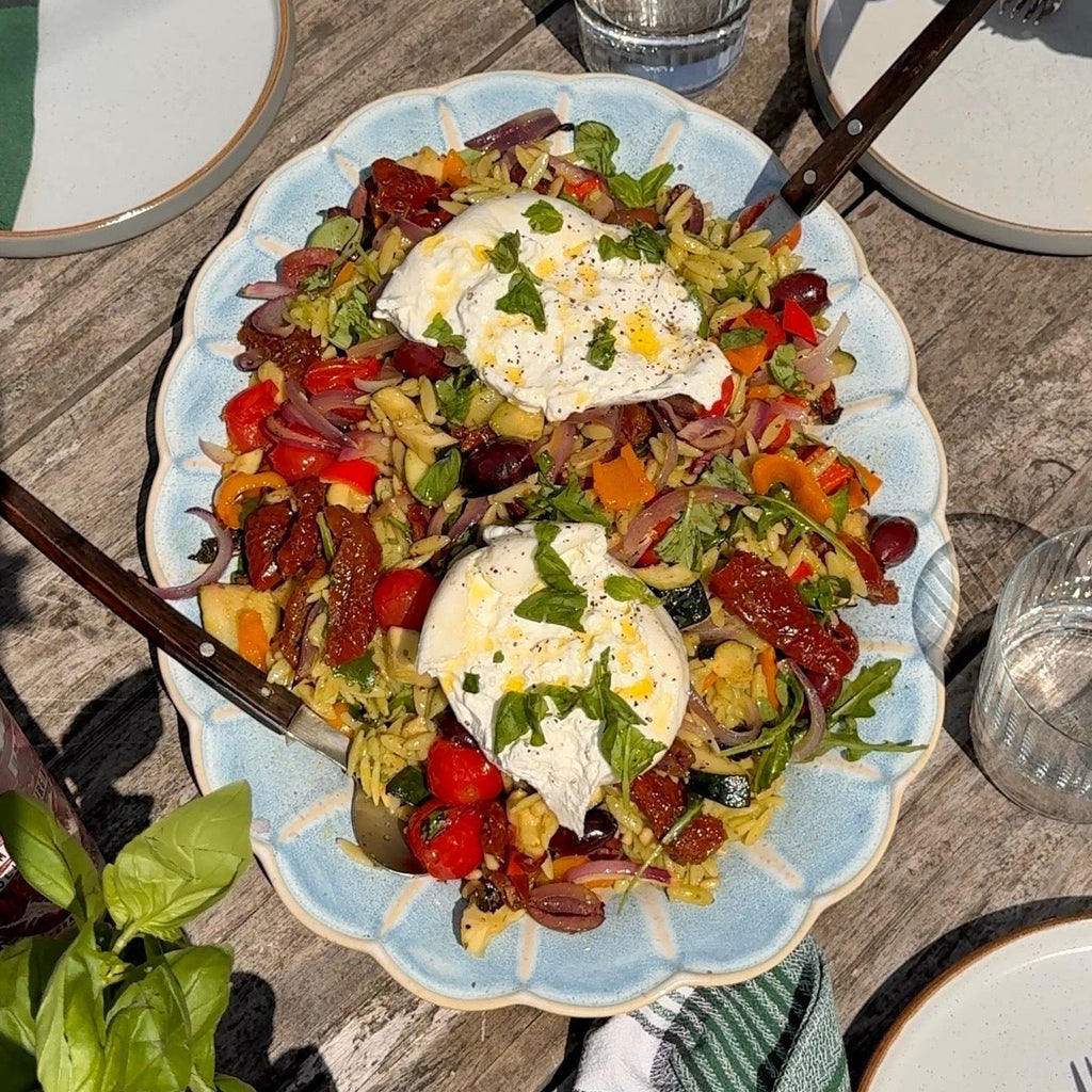 Assemble the salad: To the warm orzo, add the pesto and stir to coat. Then add the roasted vegetables, sun-dried tomatoes, olives, rocket, and pine nuts. Gently toss everything together and season with salt and pepper to taste.