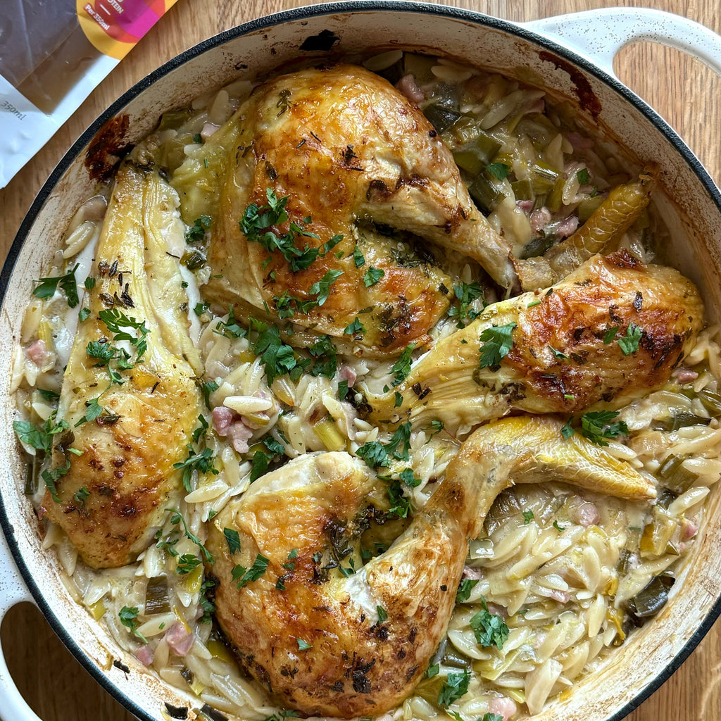 9. Carve and serve the chicken with the creamy orzo and leeks, finishing with fresh herbs if desired.