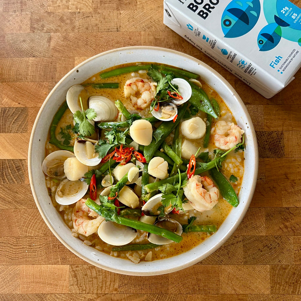 3. Stir fry this for one minute before adding in the Freja Fish Bone Broth and 1 can of coconut milk, keep this on a high heat until it comes to a boil.