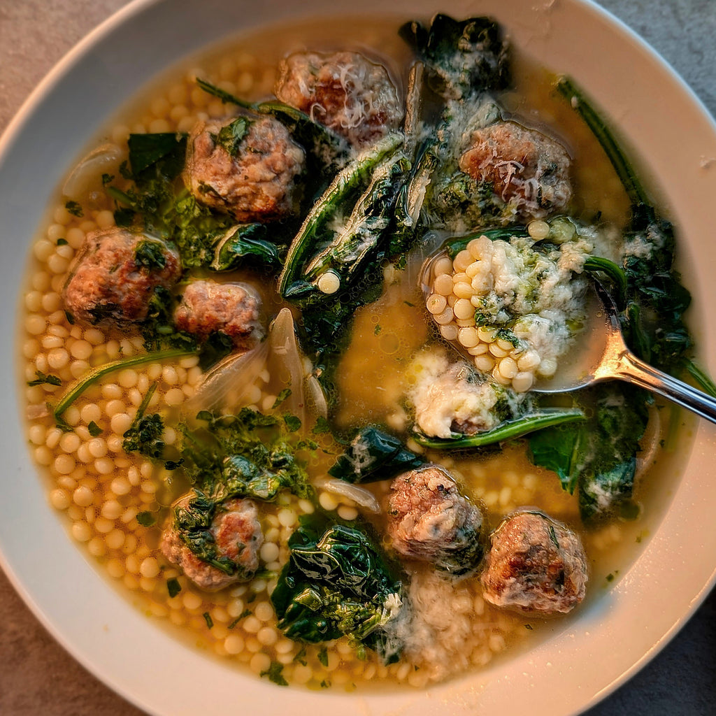 - In the meantime add the oil to a pot on medium high and the onion sautéing for 1-2 min. Add Freja Chicken Bone Broth, bring to a boil then add the meatballs and simmer on low for 10 min to cook through and let the flavours melt. Stir in the spinach to wilt.